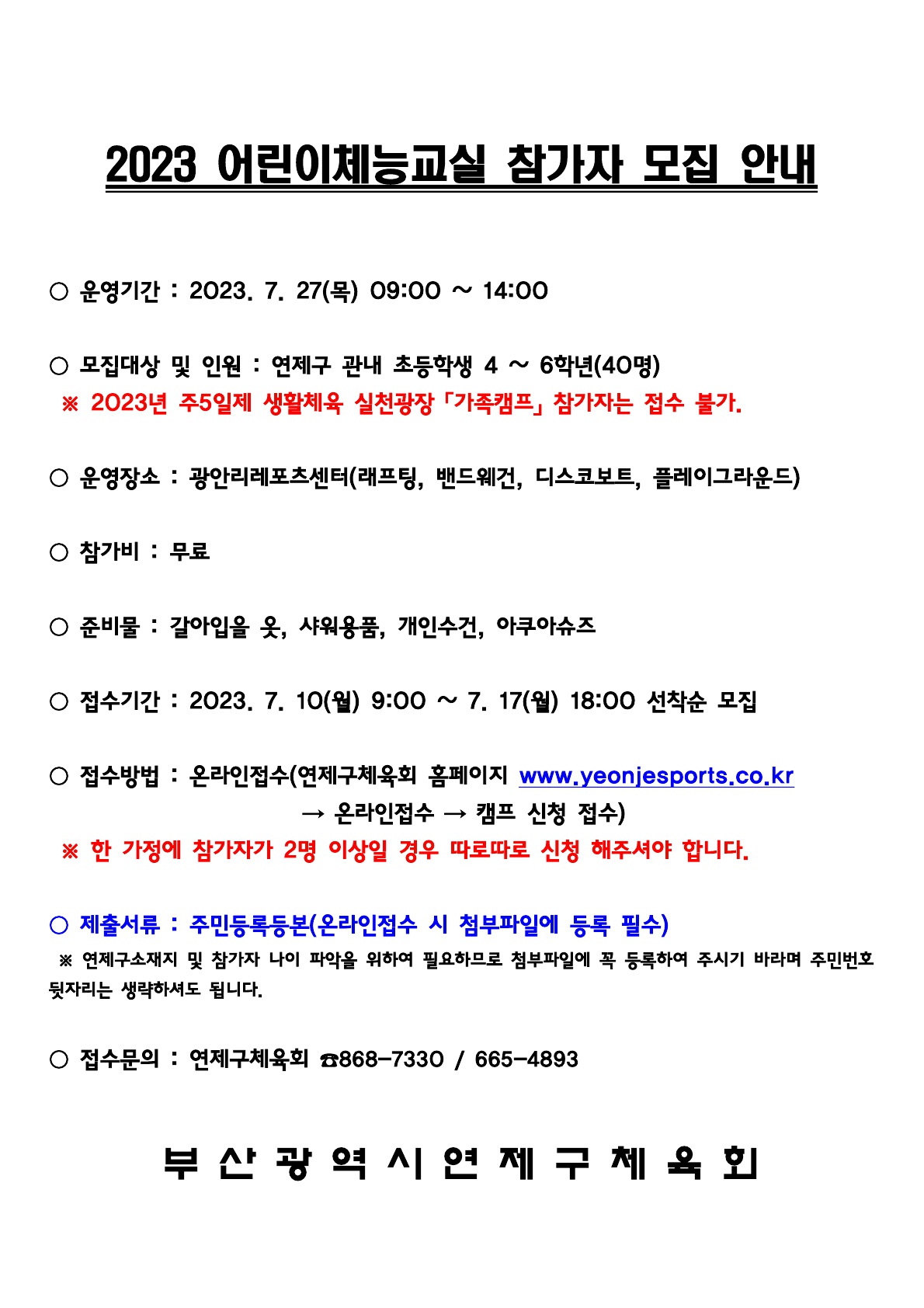 2023년 연제구 어린이체능교실 참가자 모집안내